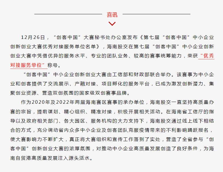 2023年2月16日下午,由海南省工信廳主辦,文昌市科工信局、海南股交承辦,海南省發(fā)改委、海南省稅務(wù)局、海南省人社廳、海南省知識(shí)產(chǎn)權(quán)局提供支持的2023年海南省中小企業(yè)政策宣貫活動(dòng)在文昌市溫德姆至尊豪延酒店舉行...