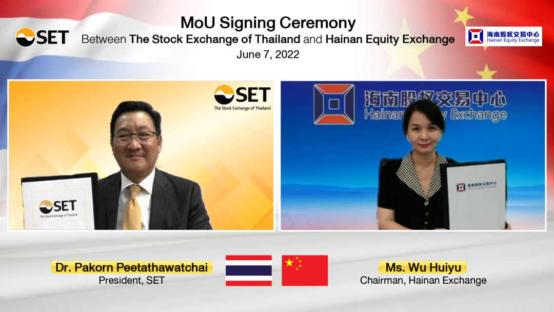 近日,海南股權(quán)交易中心與泰國證券交易所舉辦合作諒解備忘錄線上簽約儀式。海南股權(quán)交易中心董事長吳惠玉、泰國證券交易所總裁帕功·比達塔瓦猜(PakornPeetathawatchai)共同簽署《海南股權(quán)交易中心與泰國證券交易...