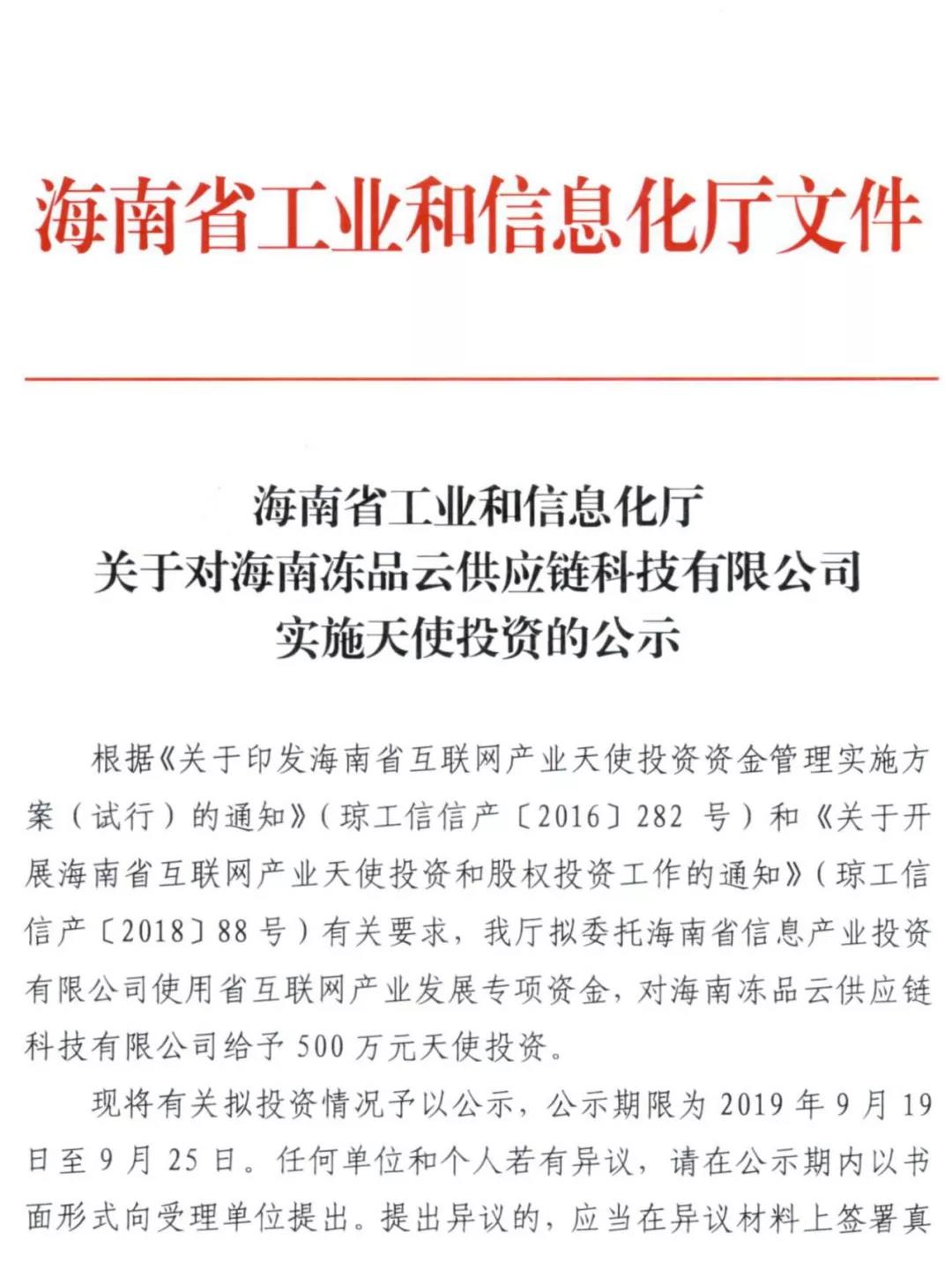 近期,海南省工業(yè)和信息化廳發(fā)布關(guān)于對(duì)海南股權(quán)交易中心掛牌企業(yè)海南凍品云供應(yīng)鏈科技有限公司實(shí)施天使投資的公示,擬委托海南省信息產(chǎn)業(yè)投資有限公司使用省互聯(lián)網(wǎng)產(chǎn)業(yè)發(fā)展專項(xiàng)資金,對(duì)海南凍品云供應(yīng)鏈科技有限公司...