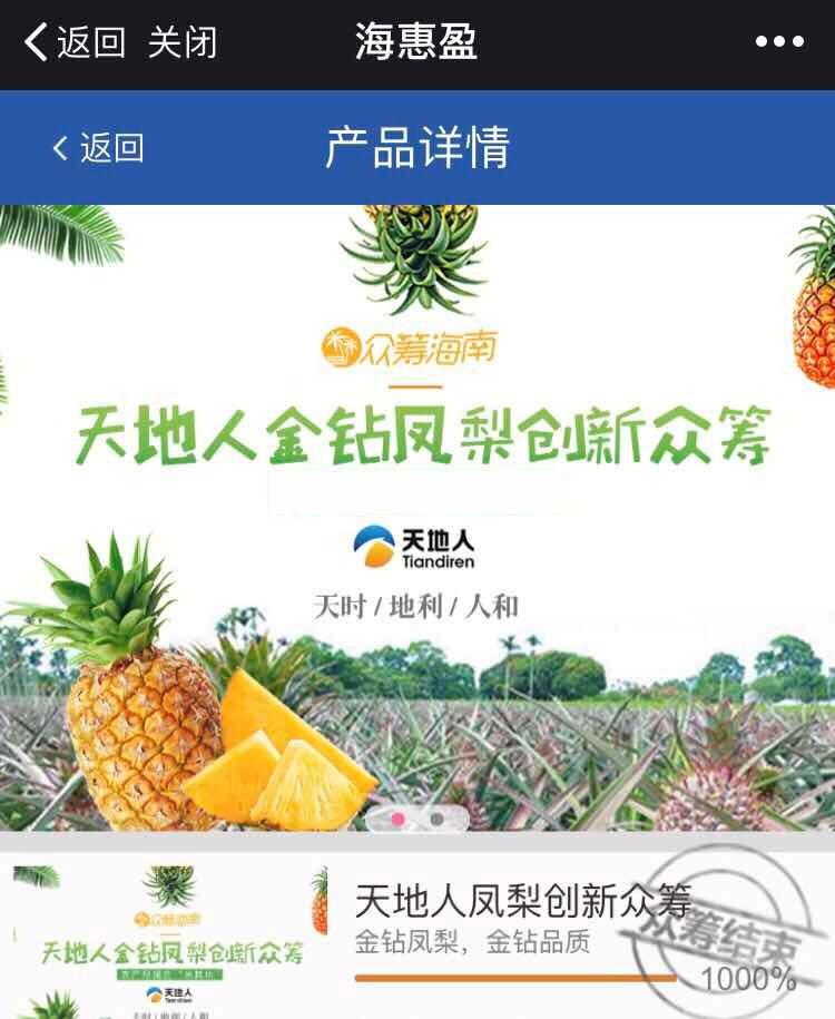 3月22日,海南股權(quán)交易中心天地人鳳梨創(chuàng)新眾籌項目圓滿結(jié)束,計劃眾籌金額10萬元,項目上線僅5分鐘,成功募集金額100萬元,是預(yù)期目標(biāo)金額的10倍。天地人鳳梨眾籌項目,是股交中心2018年在?;萦脚_上線的首單創(chuàng)新...