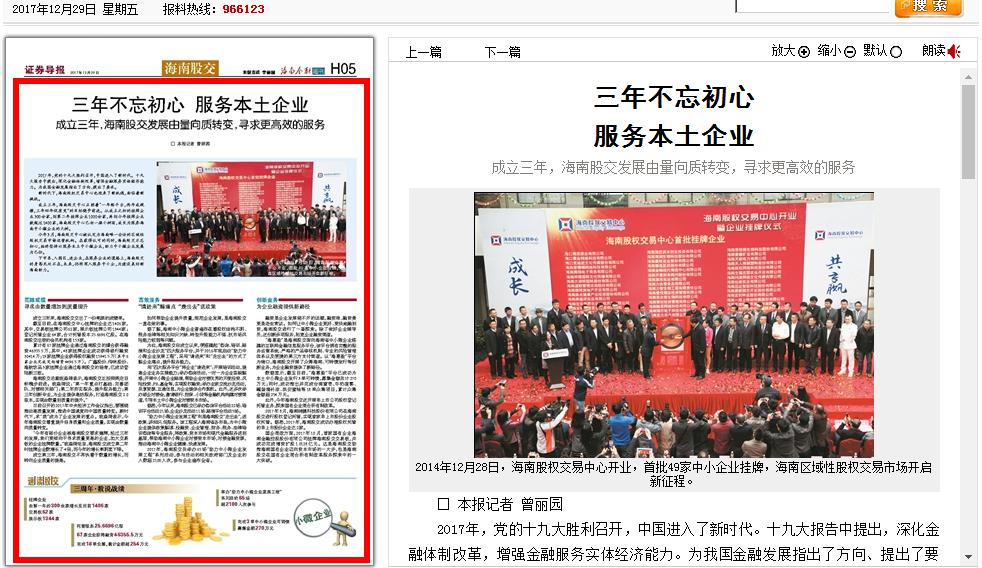 近日,證券導(dǎo)報(bào)以四個(gè)版面整版報(bào)道海南股權(quán)交易中心,關(guān)注股交中心三年以來(lái)的發(fā)展。其中,通過(guò)一個(gè)版面的篇幅,提煉總結(jié)了股交中心的亮點(diǎn)工作及服務(wù)企業(yè)、創(chuàng)新業(yè)務(wù)等方面的突破和股交中心三年以來(lái)取得的成績(jī)。報(bào)道指...