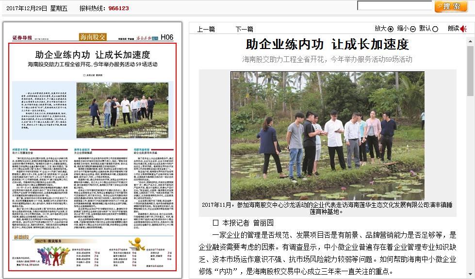 在海南股權(quán)交易中心成立三周年之際,證券導(dǎo)報(bào)以四個(gè)版面整版報(bào)道海南股權(quán)交易中心,關(guān)注股交中心三年以來(lái)的發(fā)展。其中,通過(guò)一個(gè)版面的報(bào)道——《創(chuàng)新金融產(chǎn)品帶來(lái)真金白銀》,解讀了股交中心幫助企業(yè)實(shí)現(xiàn)融資的各項(xiàng)...
