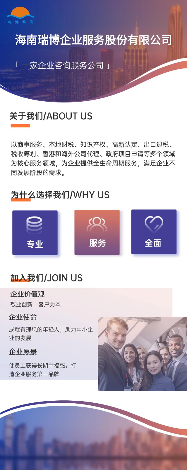 | 企業(yè)說明: | 海南瑞博企業(yè)服務(wù)股份有限公司是瑞博集團下屬子公司,自2018年海南自貿(mào)港開放以來。瑞博集團積極響應(yīng)國家的號召,通過充分考察后,于海南省??谑谐闪⒑D先鸩┢髽I(yè)服務(wù)股份有限公司,主要以商事服務(wù)、本地財稅、知識產(chǎn)權(quán)、高新認定、出口退稅、稅收籌劃、香港和海外公司代理、政府項目申請等多個領(lǐng)域為核心服務(wù)領(lǐng)域,為企業(yè)提供全生命周期服務(wù),滿足企業(yè)不同發(fā)展階段的需求。 瑞博集團下屬直營子公司分部在北京、西安、海南、香港等地,全國主要一二線城市的分部陸續(xù)成立中,跨區(qū)域配合,輻射全國,以滿足客戶跨區(qū)域服務(wù)需求;同時瑞博持續(xù)拓展延伸資源合作平臺,引入各類商業(yè)服務(wù)機構(gòu)供應(yīng)鏈合作機構(gòu),打通了產(chǎn)業(yè)鏈上下游領(lǐng)域的立體服務(wù)生態(tài),企業(yè)全品類服務(wù)能力,得到了廣大的客戶的認可與信賴。 |