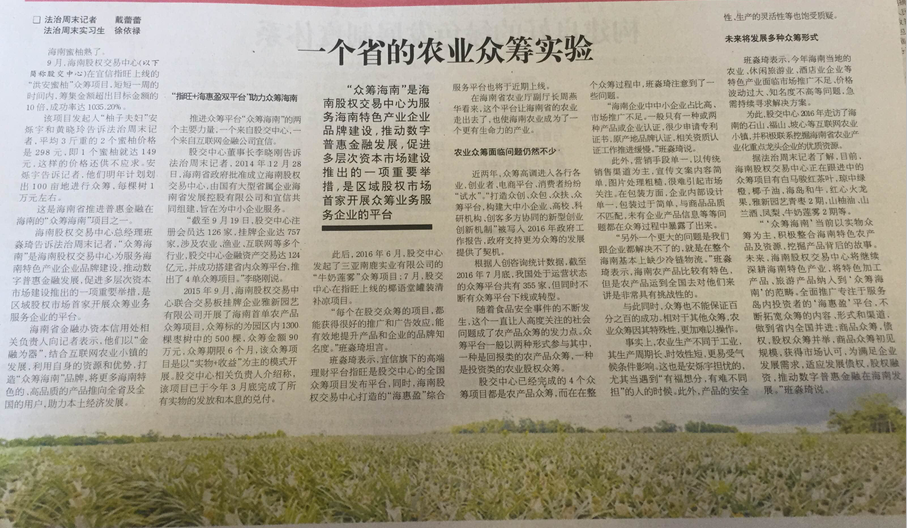 “眾籌海南”作為海南股權交易中心推動海南特色產(chǎn)業(yè)發(fā)展的一項重要舉措,持續(xù)受到媒體關注。最近,面向全國公開發(fā)行的具有鮮明法治特色的中央級主流政經(jīng)周報——《法治周末》以半版篇幅刊發(fā)了《一個省的農(nóng)業(yè)眾籌實驗》專題文章。