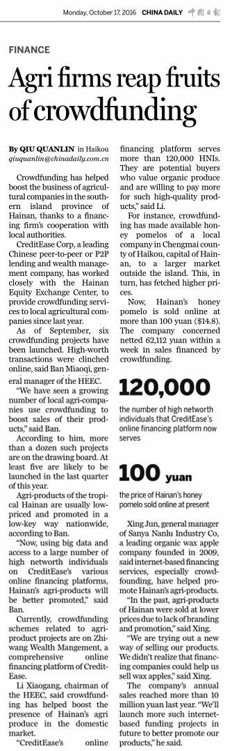 文章寫道,“CreditEase Corp, a leading Chinese peerto peer or P2P lending and wealth management company, has worked closely with the Hainan Equity Exchange Center, to provide crowdfunding services to local agricultural companies since last year. Agri-products of the tropical Hainan are usually lowpriced and promoted in a lowkey way nationwide, according to Ban. ‘Now, using big data and access to a large number of high networth individuals on CreditEase’s various online financing platforms,Hainan’s agriproducts will be better promoted, ’said Ban.”(譯注:互聯(lián)網(wǎng)金融領先企業(yè)宜信公司與海南股權(quán)交易中心密切合作,從去年開始為當?shù)氐霓r(nóng)業(yè)公司提供眾籌服務。海南熱帶農(nóng)產(chǎn)品通常價格較低,在全國推廣的方式也很低調(diào),據(jù)班淼琦介紹,“現(xiàn)在,通過使用大數(shù)據(jù)和擁有大量高凈值人群的宜信在線融資平臺,海南的農(nóng)產(chǎn)品將得到更好的推動?!保?/span>