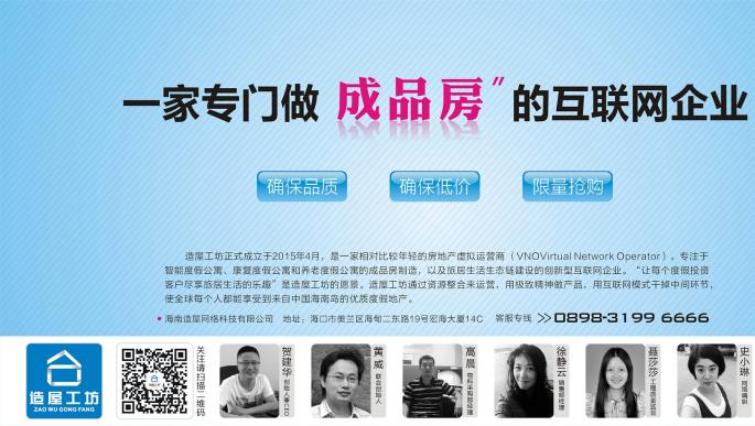 一、我們的服務:房地產(chǎn)虛擬運營商(VNO—VirtualNetwork Operator),專注于個人購房的個性化定制、標準化定制和定向定制的服務,以及居住生活生態(tài)鏈建設的創(chuàng)新型互聯(lián)網(wǎng)企業(yè)。虛擬運營商就像是經(jīng)銷商,擁有技術(shù)能力、產(chǎn)品供應能力和市場能力等從開發(fā)商那里獲得房源信息,然后通過自己的計費系統(tǒng)、客服專號、市場營銷和管理體系,將成品房及增值服務以套餐形式賣給終端消費者,緩解開發(fā)商的銷售壓力。 發(fā)展歷程:2015年7月8日造屋工坊官方微信平臺上線 2015年4月9日公司成立,專注于“方便客戶找到適合的房子”