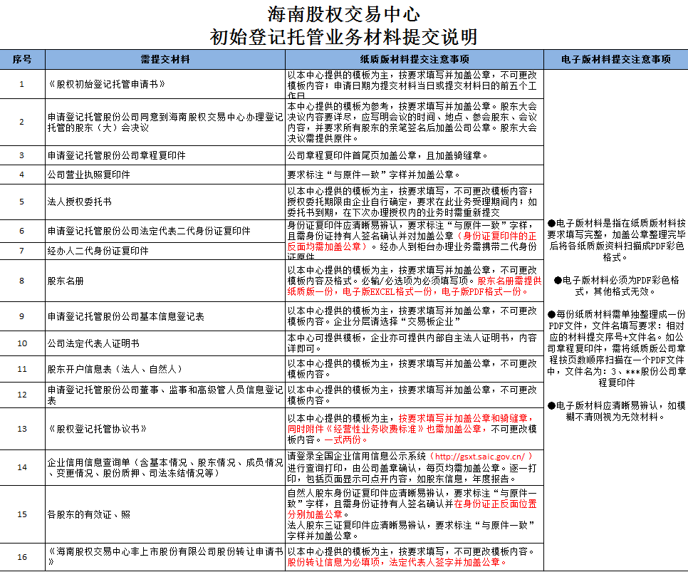 海南股權(quán)交易中心初始登記托管業(yè)務(wù)材料提交說(shuō)明