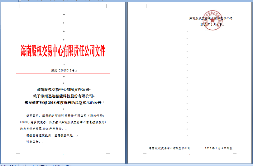 海南股權交易中心有限責任公司關于海南迅達智能科技股份有限公司未按規(guī)定披露2016年度報告的風險揭示的公告