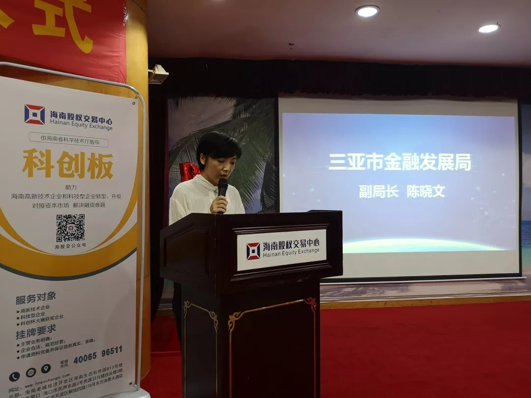 三亞市金融發(fā)展局副局長(zhǎng)陳曉文、三亞市科技工業(yè)信息化局副局長(zhǎng)蔡海寶、三亞市科技工業(yè)發(fā)展委員會(huì)副主任劉占芳、中國(guó)民生銀行三亞分行副行長(zhǎng)米淵、海南銀行三亞分行副行長(zhǎng)武掌華、興業(yè)銀行三亞分行營(yíng)業(yè)部總經(jīng)理王冰洋、中國(guó)郵政儲(chǔ)蓄銀行三亞分行小企業(yè)金融部總經(jīng)理朱寶峰、海南股交執(zhí)行總經(jīng)理程棟才、副總經(jīng)理兼財(cái)務(wù)總監(jiān)唐玉萍及相關(guān)企業(yè)代表共60余人出席儀式。