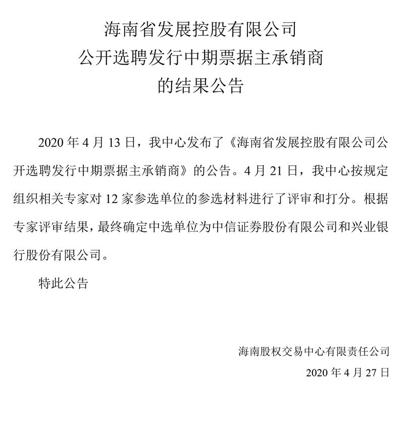 海南省發(fā)展控股有限公司公開選聘發(fā)行中期票據(jù)主承銷商的結果公告