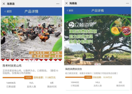 先后打造“臨高縣隆道雞”、“陳考村蜂蜜”、“加六村木瓜”、“陳考村山雞”、“海南控股愛心扶貧包”等扶貧眾籌項目。