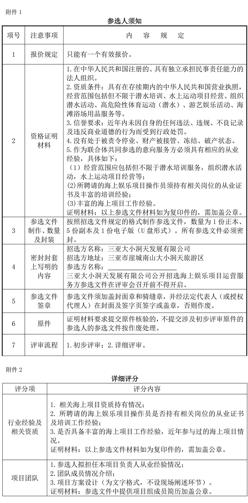 根據(jù)相關(guān)法律法規(guī),受委托,海南股權(quán)交易中心有限責(zé)任公司公開招選海上娛樂項(xiàng)目運(yùn)營服務(wù)方,為三亞大小洞天景區(qū)的海上娛樂項(xiàng)目提供盡職調(diào)查、方案設(shè)計(jì)、項(xiàng)目報批、安裝、調(diào)試、驗(yàn)收及運(yùn)營管理等服務(wù)工作。歡迎符合條件的機(jī)構(gòu)遵照本公告的有關(guān)規(guī)定報名參加,現(xiàn)將有關(guān)事項(xiàng)公告如下: