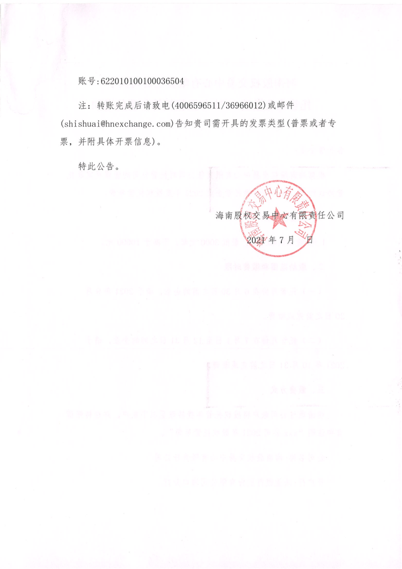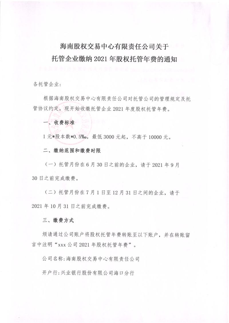 海南股權交易中心有限責任公司關于托管企業(yè)繳納2021年股權托管年費的通知