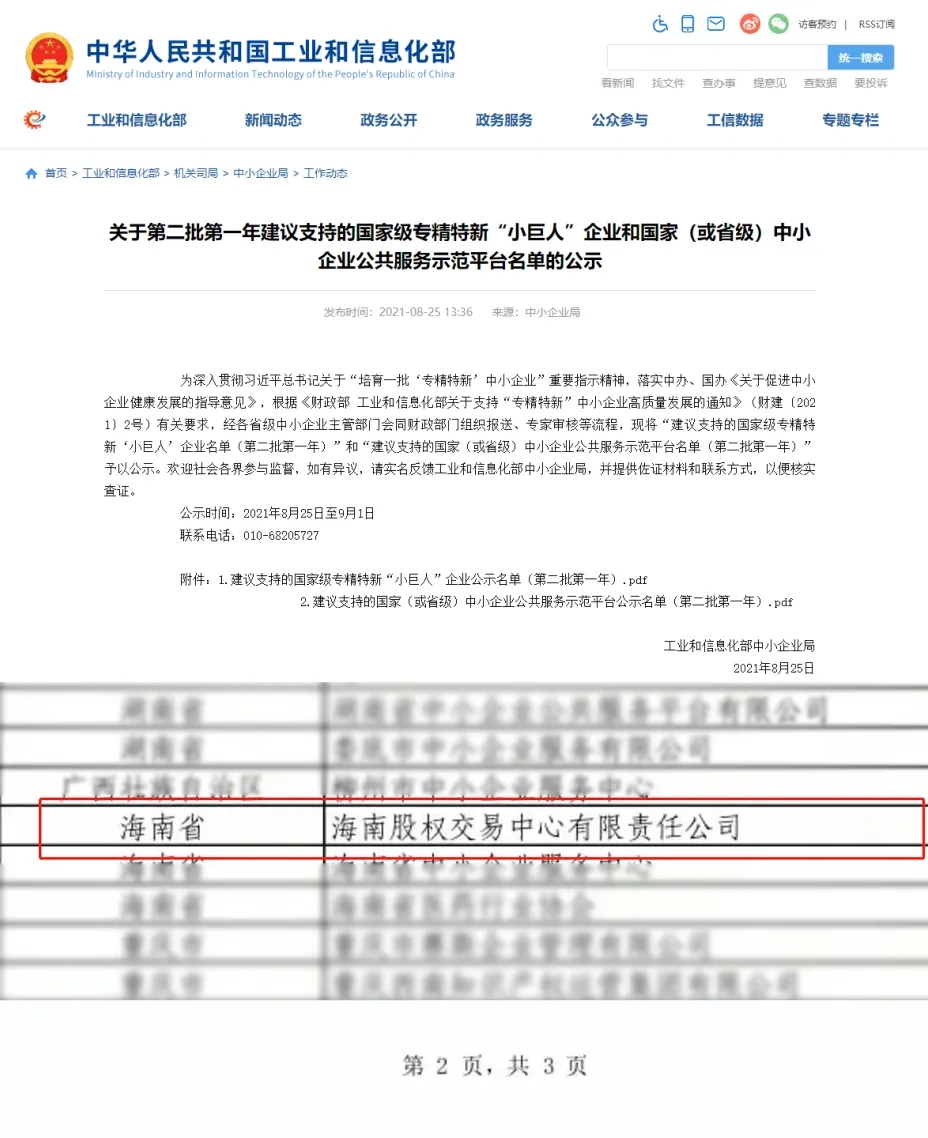 2021年8月,海南股交入選第二批“建議支持的國家(或省級(jí))中小企業(yè)公共服務(wù)示范平臺(tái)”名單。證明了海南股交服務(wù)“專精特新”中小企業(yè)的能力獲得了工信部及省工信廳的認(rèn)可。