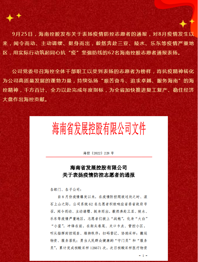 海南控股通報表揚(yáng)62名疫情防控志愿者