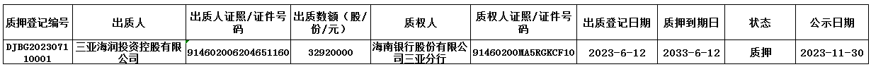 海南海潤(rùn)珍珠股份有限公司(企業(yè)代碼:993883)股東三亞海潤(rùn)投資控股有限公司于2023年7月11日在我中心辦理了股權(quán)質(zhì)押登記業(yè)務(wù),具體情況如下:
