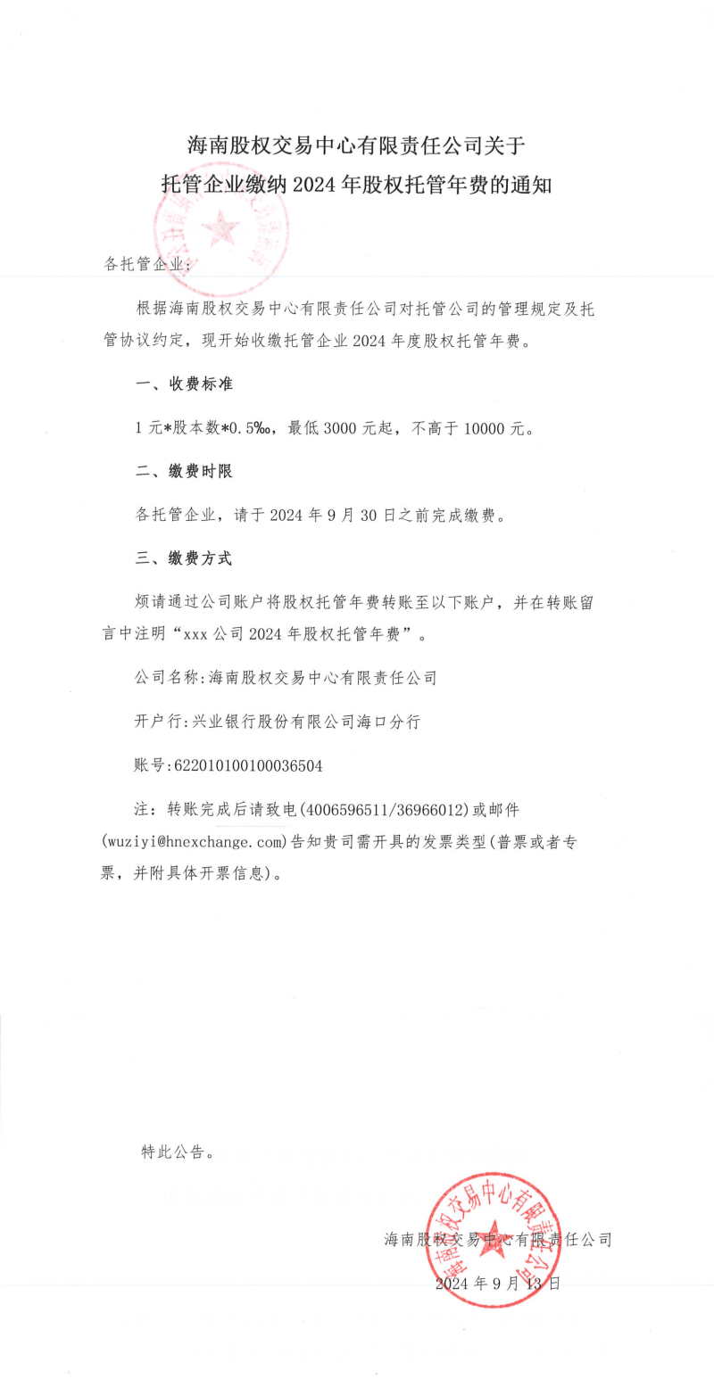 海南股權交易中心有限責任公司關于托管企業(yè)繳納2024年股權托管年費的通知