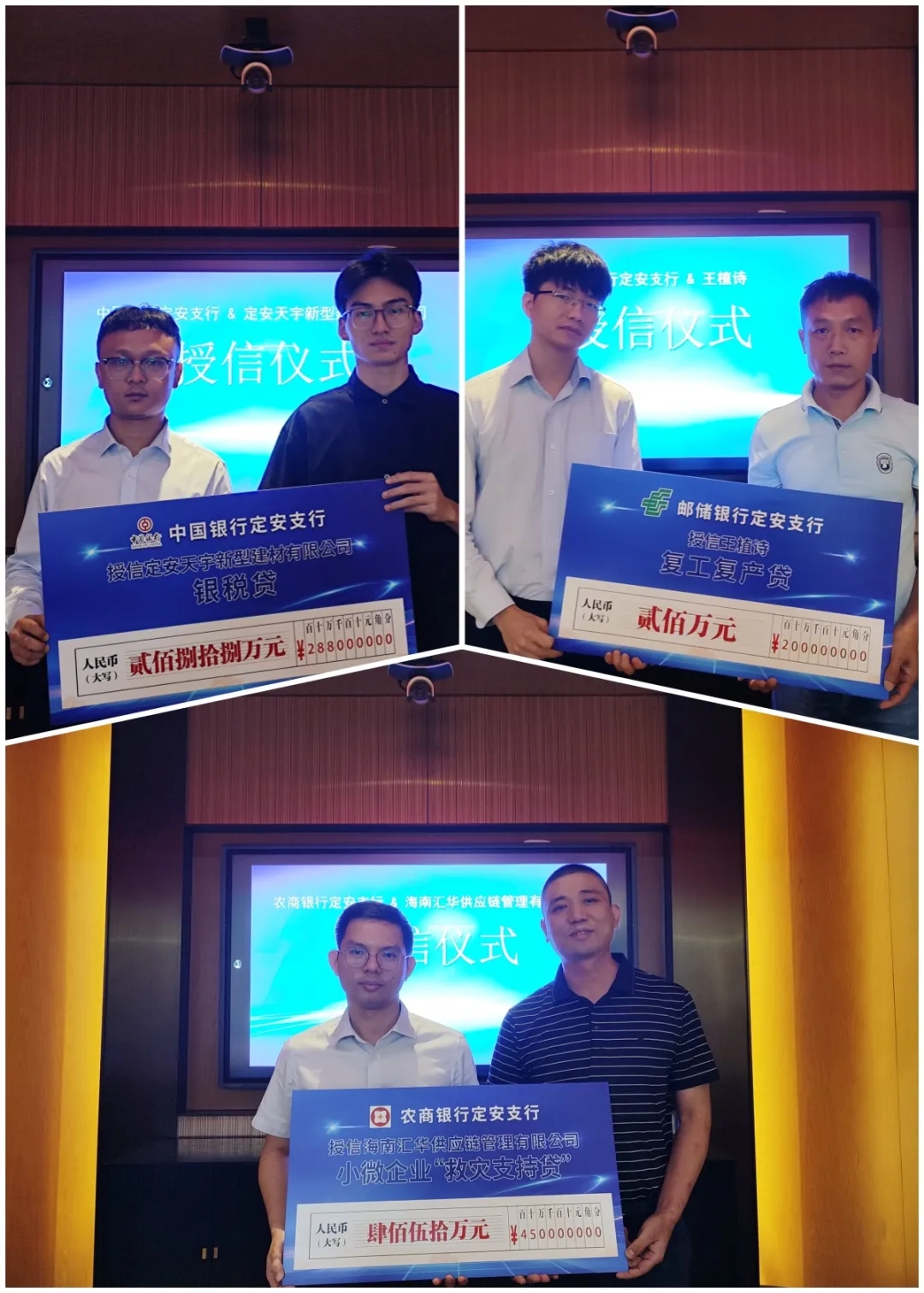 為幫助定安企業(yè)提供金融支持,中國銀行、中國建設(shè)銀行、中國農(nóng)業(yè)銀行、中國郵儲銀行、海南農(nóng)商行、海南銀行等金融機構(gòu)分別介紹了各自專屬的金融產(chǎn)品和服務(wù),并就救災(zāi)貸、復(fù)工復(fù)產(chǎn)貸及開通融資綠色通道的申請條件、辦理流程、貸款額度、貸款期限、貸款利率和政府貼息等問題進行了詳細介紹。