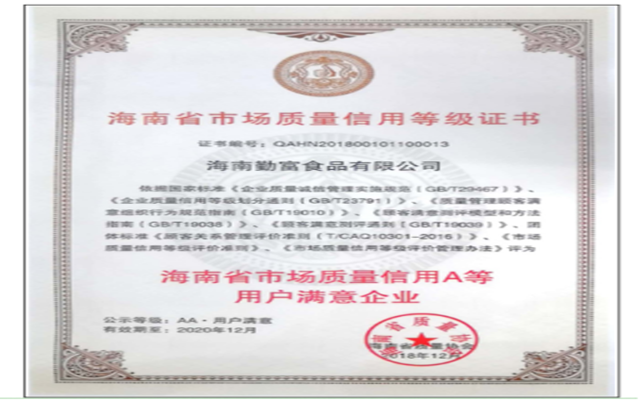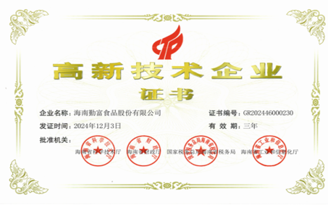 海南勤富食品股份有限公司2018年獲得海南省科技產(chǎn)業(yè)十大影響力領(lǐng)軍企業(yè);連續(xù)獲得海南省第七屆、第八屆、第九屆優(yōu)秀企業(yè);連續(xù)獲得海南省第五屆、第六屆、第七屆杰出民營(yíng)企業(yè);2019年獲得文昌市脫貧攻堅(jiān)工作先進(jìn)單位。