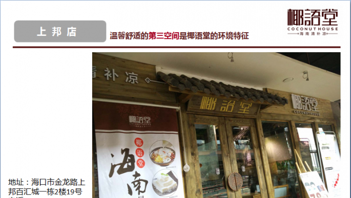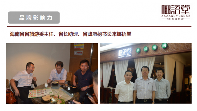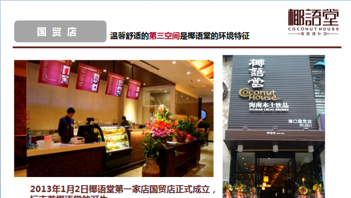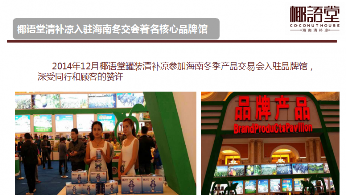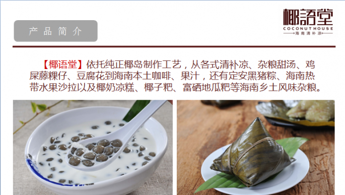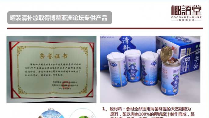 海南椰鄉(xiāng)村實(shí)業(yè)有限公司是海南省工商行政管理局批準(zhǔn)成立的有限責(zé)任公司,公司注冊(cè)資金2300萬(wàn),在職員工103人。公司下轄全資子公司??谝Z(yǔ)堂餐飲文化有限公司及??谝Z(yǔ)堂食品營(yíng)養(yǎng)科學(xué)研究院。公司根據(jù)發(fā)展目前分為三個(gè)事業(yè)部:椰語(yǔ)堂店面連鎖事業(yè)部、產(chǎn)品事業(yè)部、椰語(yǔ)堂食品營(yíng)養(yǎng)科學(xué)研究院。椰語(yǔ)堂店面連鎖事業(yè)部主要負(fù)責(zé)椰語(yǔ)堂連鎖店面的擴(kuò)張和關(guān)聯(lián)產(chǎn)業(yè)的拓展業(yè)務(wù);產(chǎn)品事業(yè)部主要負(fù)責(zé)以罐裝清補(bǔ)涼等快消品市場(chǎng)的開(kāi)拓,如目前所進(jìn)行的椰語(yǔ)堂椰奶清補(bǔ)涼工業(yè)化項(xiàng)目就是最具代表性的一項(xiàng)研究工作;椰語(yǔ)堂食品營(yíng)養(yǎng)科學(xué)研究院主要為椰語(yǔ)堂本身和第三方進(jìn)行有關(guān)食品營(yíng)養(yǎng)、配餐、產(chǎn)品研發(fā)等方面的工作,未來(lái)是椰語(yǔ)堂核心競(jìng)爭(zhēng)力的重要部分。 椰語(yǔ)堂是海南首家把海南本土以清補(bǔ)涼為代表的小吃精致化、系統(tǒng)化、標(biāo)準(zhǔn)化和研發(fā)體系化并進(jìn)行連鎖發(fā)展的企業(yè),公司致力于傳播海南文化、打造海南本土休閑美食的第一品牌。公司成立于2012年,并創(chuàng)立【椰語(yǔ)堂】品牌, 現(xiàn)已在海南望海國(guó)際廣場(chǎng)、南亞廣場(chǎng)、中山路騎樓老街、美蘭國(guó)際機(jī)場(chǎng)、上邦商業(yè)廣場(chǎng)、天涯海角景區(qū)、??谀蟻啅V場(chǎng)、廣東中山市、海口國(guó)貿(mào)大道正昊店、三亞亞龍灣熱帶天堂森林公園、海口友誼廣場(chǎng)店等地開(kāi)設(shè)11家連鎖店并開(kāi)始北京、天津、遼寧、江蘇等島外市場(chǎng)的拓展,由于其濃郁的海南本土特色和優(yōu)秀的品質(zhì)感受到社會(huì)各界的廣泛好評(píng),椰語(yǔ)堂椰奶清補(bǔ)涼等六款小吃被餐飲行業(yè)權(quán)威機(jī)構(gòu)海南省烹飪協(xié)會(huì)、海南省瓊菜研究中心評(píng)為海南名小吃和海南瓊菜(風(fēng)味小吃)一級(jí)品牌名店。央視CCTV-2、旅游衛(wèi)視、海南電視臺(tái)、內(nèi)蒙衛(wèi)視、海南日?qǐng)?bào)、航空高端雜志【云端】、中國(guó)美食第一刊【東方美食】【餐飲經(jīng)理人】、【勇闖地球主持人伊恩.萊特】、【新浪美食】、【南島視界】、【海南旅游商品協(xié)會(huì)雜志創(chuàng)刊號(hào)】、去哪兒吃【海南美食】食尚海南等國(guó)內(nèi)外知名媒體都進(jìn)行了宣 傳報(bào)道,成為了海南文化的傳播和弘揚(yáng)者,并打造成展示海南國(guó)際旅游島本土文化的一張亮麗名片。 海南椰鄉(xiāng)村實(shí)業(yè)有限公司注冊(cè)成立了“??谝Z(yǔ)堂食品營(yíng)養(yǎng)科學(xué)研究院”并和海南大學(xué)食品學(xué)院深度合作,充分利用海南大學(xué)食品學(xué)院的科研力量和實(shí)驗(yàn)設(shè)備,集結(jié)了海南大學(xué)和其它領(lǐng)域的教授、專(zhuān)家,進(jìn)行產(chǎn)品的研發(fā)和標(biāo)準(zhǔn)的制定,定期進(jìn)行營(yíng)養(yǎng)成分抽檢和出品品質(zhì)監(jiān)控,旨在為消費(fèi)者提供食品更加安全、營(yíng)養(yǎng)更加豐富、品種更加齊全的海南本土特色休閑美食。 2014年,政府為發(fā)展海南省地方特色產(chǎn)業(yè),從眾多的申報(bào)項(xiàng)目中篩選后對(duì)我司進(jìn)行了300萬(wàn)人民幣股權(quán)投資。 2014年12月,我司受邀參加2014年中國(guó)(海南)國(guó)際熱帶農(nóng)產(chǎn)品冬季交易會(huì),我司推出的“椰語(yǔ)堂罐裝清補(bǔ)涼”在海南省品牌館和??谑衅放起^進(jìn)行展示。本產(chǎn)品原材料全部選用消暑降溫的天然粗糧為原料,配以海南100%的椰奶原汁制作而成,品質(zhì)純正、綠色、天然又健康,清涼可口、營(yíng)養(yǎng)又健康。通過(guò)此次展會(huì),“椰語(yǔ)堂罐裝清補(bǔ)涼”贏得了島內(nèi)外顧客的一致好評(píng),成為此次冬交會(huì)上獨(dú)具一格的風(fēng)景。 2015年3月,我司“椰語(yǔ)堂罐裝清補(bǔ)涼”正式成為亞洲博鰲論壇專(zhuān)供產(chǎn)品,為世界各國(guó)領(lǐng)導(dǎo)人所品用。 目前在??跈C(jī)場(chǎng)、??谥寥齺唲?dòng)車(chē)、廣深高鐵、部分商場(chǎng)、淘寶等互聯(lián)網(wǎng)渠道已經(jīng)開(kāi)始椰語(yǔ)堂灌裝清補(bǔ)涼產(chǎn)品的銷(xiāo)售。 |